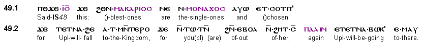 Věnujme se nyní srovnání výroku č. 49 z Tomášova evangelia a jeho podoby v evangeliích ostatních. Jde zde o přímo čítankový případ zamlžení původního významu jednoho z článku „manuálu“ a rozpliznutí konkrétní informace v nic neříkající posvěcený blábol. Čtěte prosím: