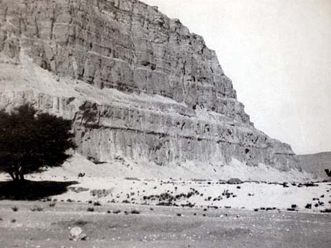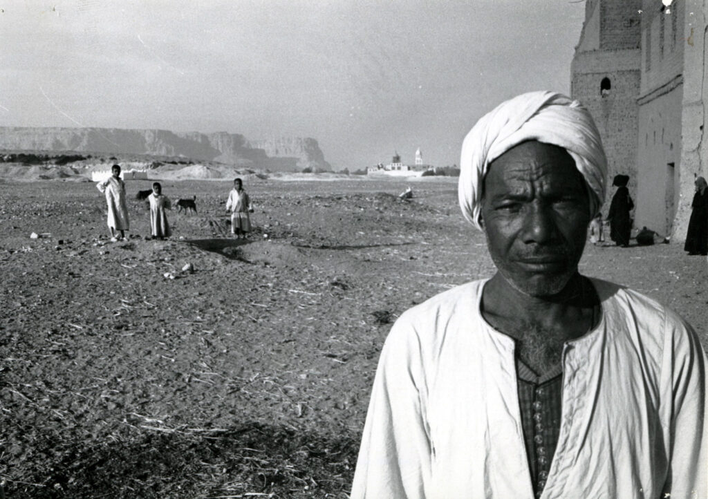 Objevitel fantastického pokladu Muhammad Ali Khalifah al-Samman stojí ve vesnici al-Qasr. V pozadí vpravo Deir Anba-Balamūn (klášter sv. Palamon) a Jabal al-Tarif je na levé straně.